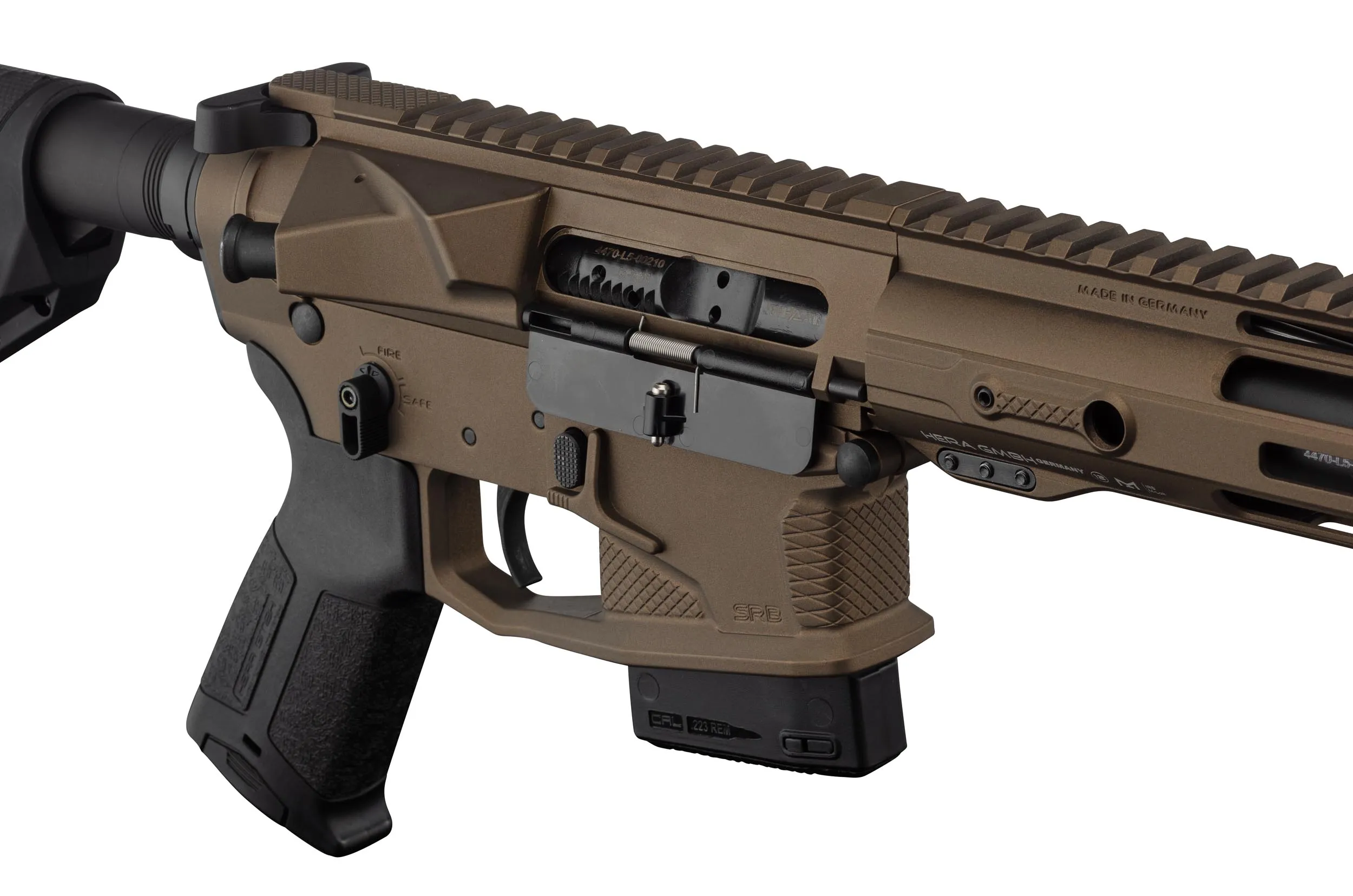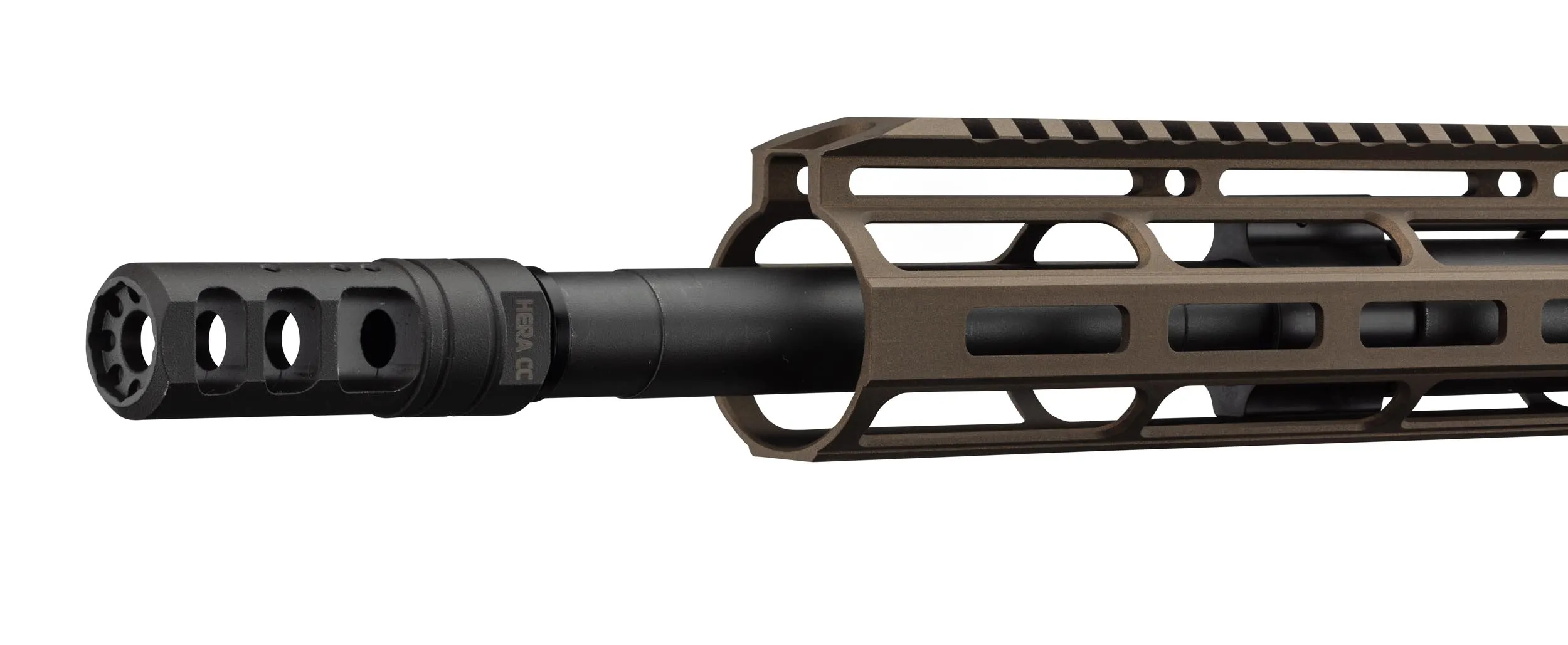 Le upper lui-aussi Brown Cerakote fonctionne par emprunt de gaz et bénéficie d’un canon au pas de rayure de 1/9 d’une longueur de 11.5 pouces. Complété par un compensateur HERA ARMS LCS de 75 mm et 181 grammes permettant de dissiper l’effet de blast. Ce dernier est doté d’un garde main bénéficiant d’un rail picatinny sur le dessus et M-lock sur l’ensemble des faces permettant d’adjoindre tous types d’équipements supplémentaires.