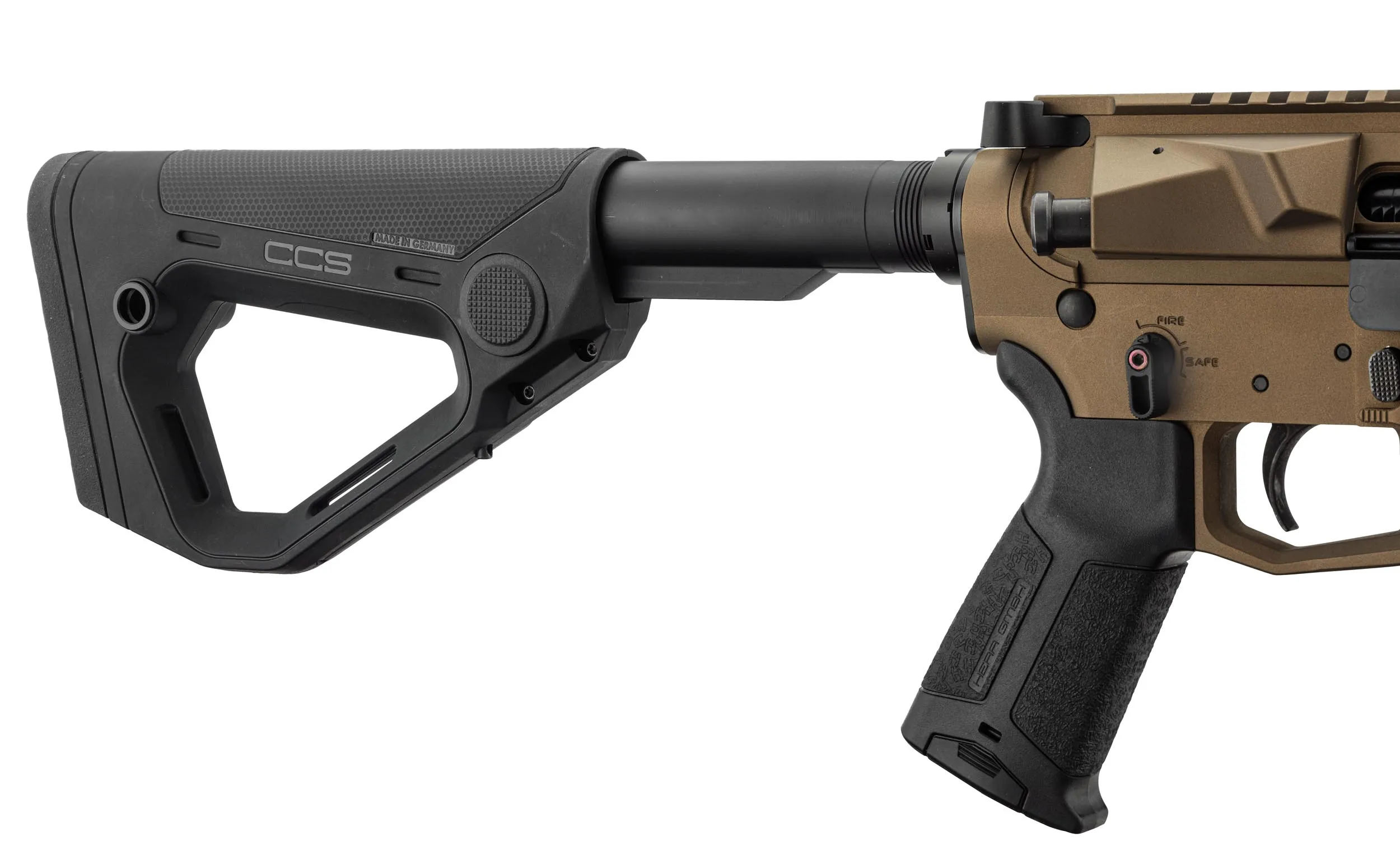 Le lower Brown Cerakote est équipée d’une crosse HERA ARMS CCS ajustable en longueur sur tube MILSPEC à verrouillage automatique et deux emplacements de bretelle type Quick Detach ainsi q’un rail picatinny amovible permettant l’utilisation d’un mono pied.