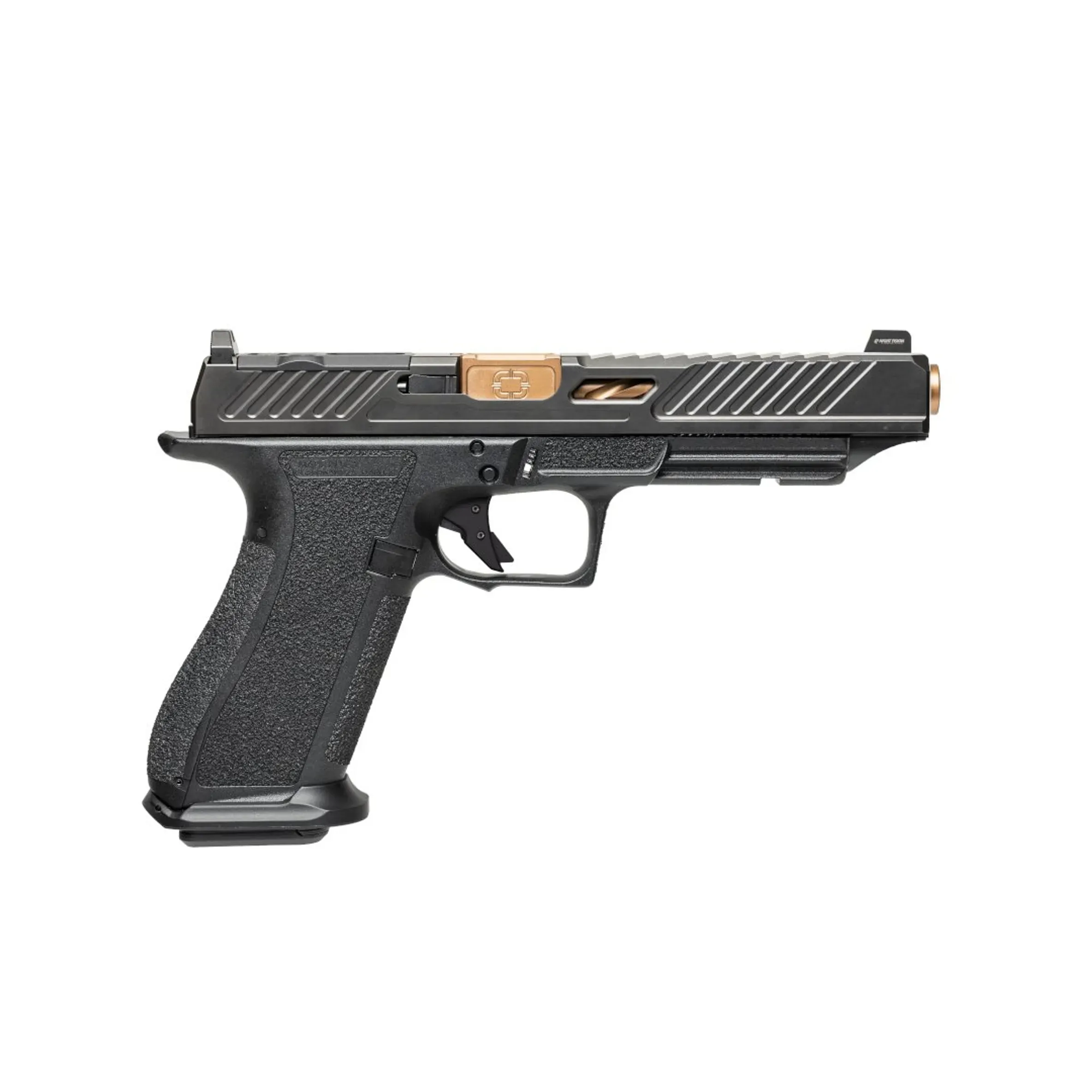 La détente en aluminium à face plate et à sécurité intégrée a une force de traction de 4,5 à 5,0 lbs, un réarmement net et tactile. La découpe optique brevetée permet aux tireurs de monter l'optique mini point rouge de leur choix. La découpe optique du DR920L peut accueillir la plupart des grandes marques d'optiques RDS directement montées sur la glissière, sans plaques ou adaptateurs intermédiaires*.