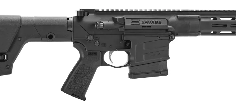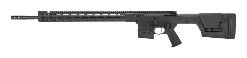 Carabine avec chargeur 10 coups. Levier latéral d'armement fixe au tir. Design AR10 Compact. Canon médium 20 pouces avec traitement Mélonite QPQ. Emprunt de gaz réglable. Garde main flottant. Rail M-Lock. Détente Blackhawk Blaze 2 stage. Crosse Magpul PRS Gen 3.