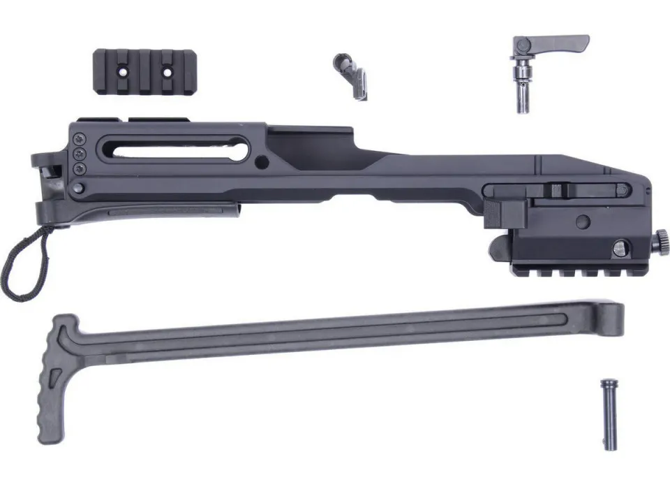 Note : cet ensemble est en vente libre, néanmoins, considérant la réglementation actuelle qui ne prévoit pas ce cas de figure, il est conseillé de monter la crosse uniquement au stand de tir et de l'enlever pour le transport (durée de l'opération moins de 10 secondes). L'arme reste une arme de poing.