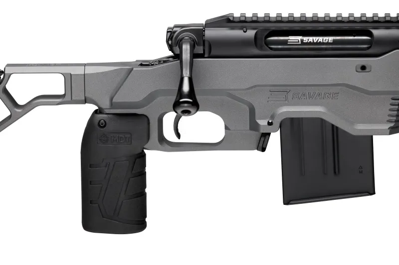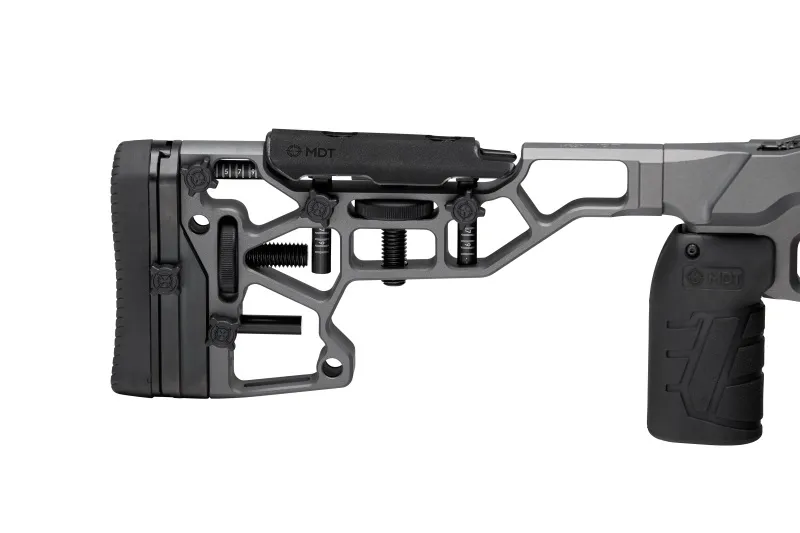 Châssis MDT ACC aluminium avec crosse entièrement réglable. Rail ARCA le long du châssis. Boîtier target inox avec revêtement nitride. Corps de culasse revêtement titane. Détente Accu Trigger personnalisable de 1,5 à 4 lb. Frein de bouche. Poignée verticale MDT. Chargeur standard AICS. Filetage 5/8X24.
