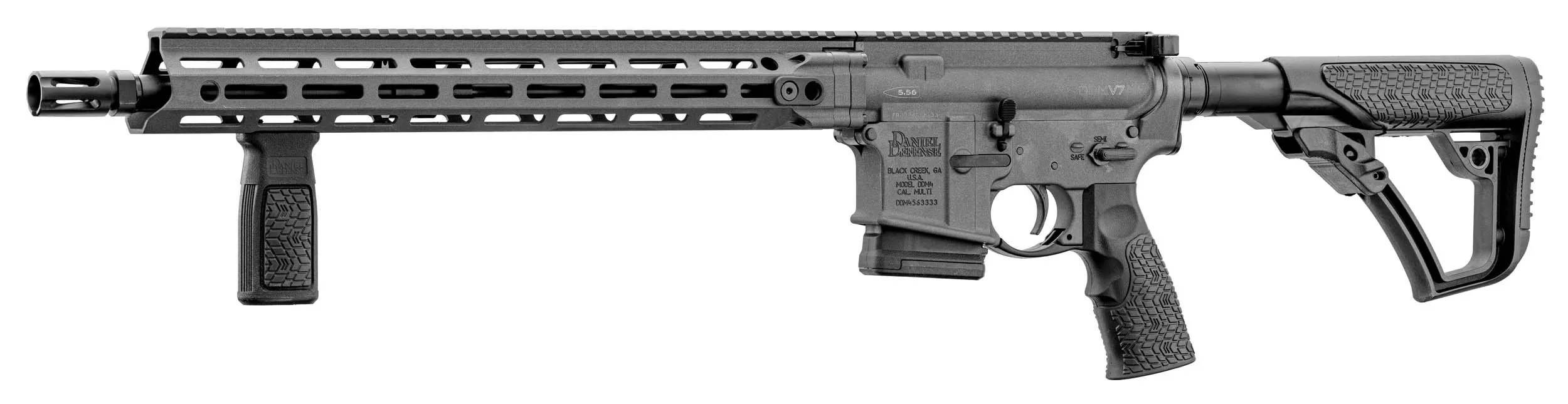Avec les points de fixation M-LOK sur 7 positions et un rail Picatinny 1913 ininterrompu sur le dessus, le V7 dispose de beaucoup d'espace pour les viseurs, les optiques et les accessoires dont l'utilisateur peut avoir besoin. La poignée de chargement GRIP-N-RIP indépendamment ambidextre s'adapte aux tireurs gauchers et droitiers. Cette carabine est également livrée avec la crosse ergonomique Daniel Defense et la poignée pistolet.