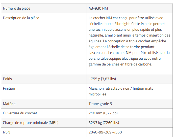 Associé à l’échelle double Fibrelight, ce crochet permet une technique d’ascension plus rapide et plus naturelle, améliorant significativement le temps d’insertion des équipes lors des phases d’assaut, de franchissement ou d’abordage.