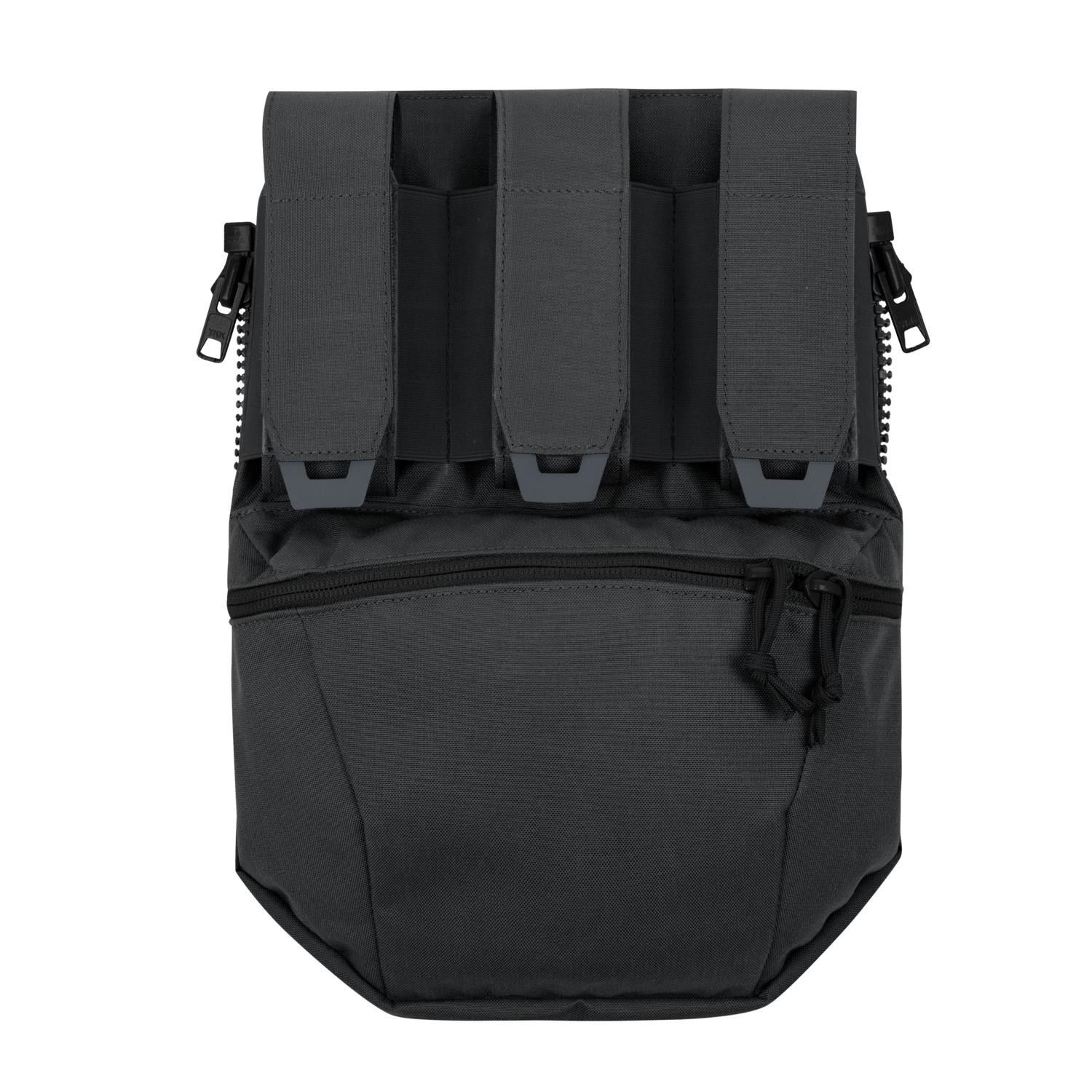La disposition des poches du panneau d'assaut a été conçue pour s'adapter au rôle de CQB. La partie supérieure comporte trois poches à fermeture Velcro® pour ranger différents types de grenades assourdissantes ou de chargeurs de rechange. Une grande poche cargo universelle zippée est montée en dessous. Doublée de velours doux, elle permet de transporter des objets sensibles aux rayures, comme des lunettes de protection oculaire ou des lunettes de protection NV. Sous le panneau, une poche plate, fixée par Velcro®, accueille une poche d'hydratation ou des outils d'effraction.