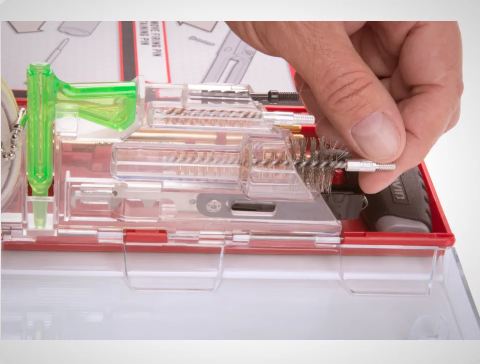 Chaque outils adaptés aux AR15 dont le fameux grattoir "Carbon scraper" sont soigneusement rangés dans une boite en polycarbonate. Le couvercle de celle-ci intègre une zone aimantée pour le stockage des pièces lors du démontage et évite ainsi toutes pertes.