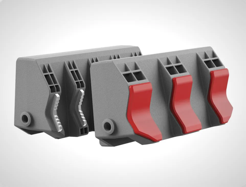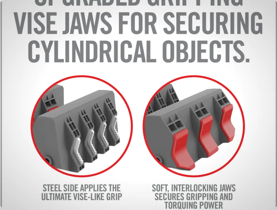 D'un côté, la surface caoutchoutée en forme de V, pour les objets fragiles comme les modérateurs de son, offre un support non marquant et résistant à la chaleur qui garantit une grande puissance de maintien sans endommager le produit. De l'autre côté, une surface métallique en forme de V offre une prise ultime semblable à celle d'un étau pour des matériaux robustes tels que des tubes en fonte ou en acier où les rayures ne sont pas un problème.