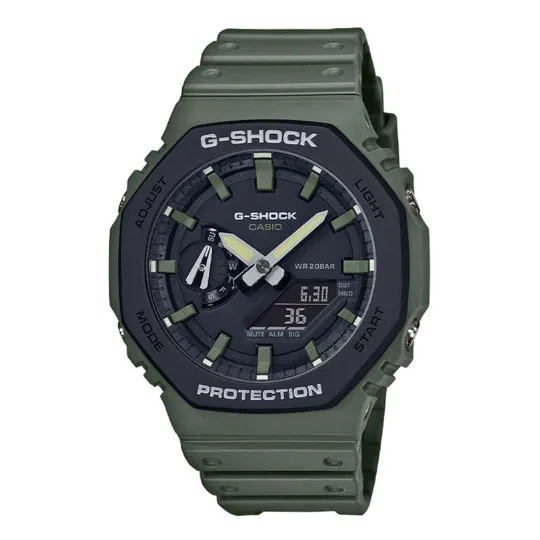 Fine et légère, la montre-bracelet G-Shock GA-2110 est robuste grâce à son cadran en verre minéral et ses boîtier et bracelet en résine, un matériau durable et souple. De forme octogonale aux lignes originales et décontractées, ce modèle analogique et numérique présente une conception simple qui élimine l'accessoire.