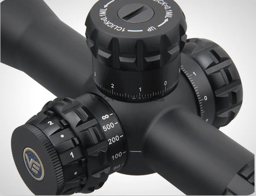 Réglage de la tourelle exposée avec fonction d'arrêt à zéro et de verrouillage de la tourelle, 100 clics par révolution