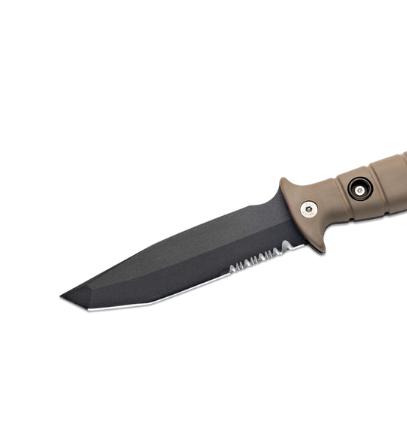 Il est doté d'un tranchant tranchant pour utiliser la pierre à feu incluse et d'un dos plat pour un bâtonnage efficace. Sa denture élaborée comprend une première dent pour couper les connecteurs de casque, suivie de plusieurs dentures pour couper les sangles ou les cordes.