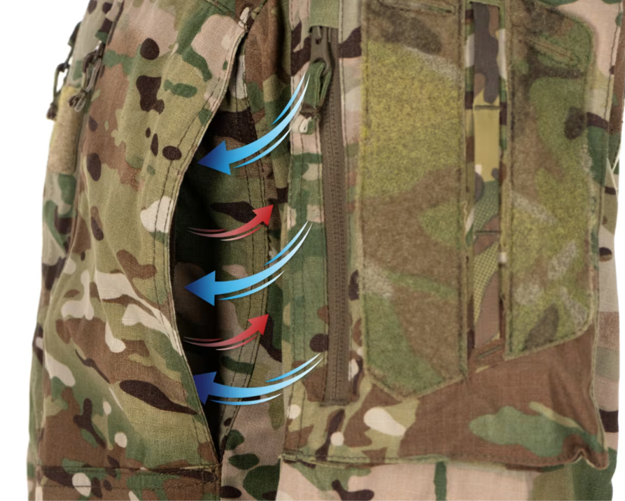 Surface Velcro pour fixer des équipements sur les poches des bras et à l'arrière du col