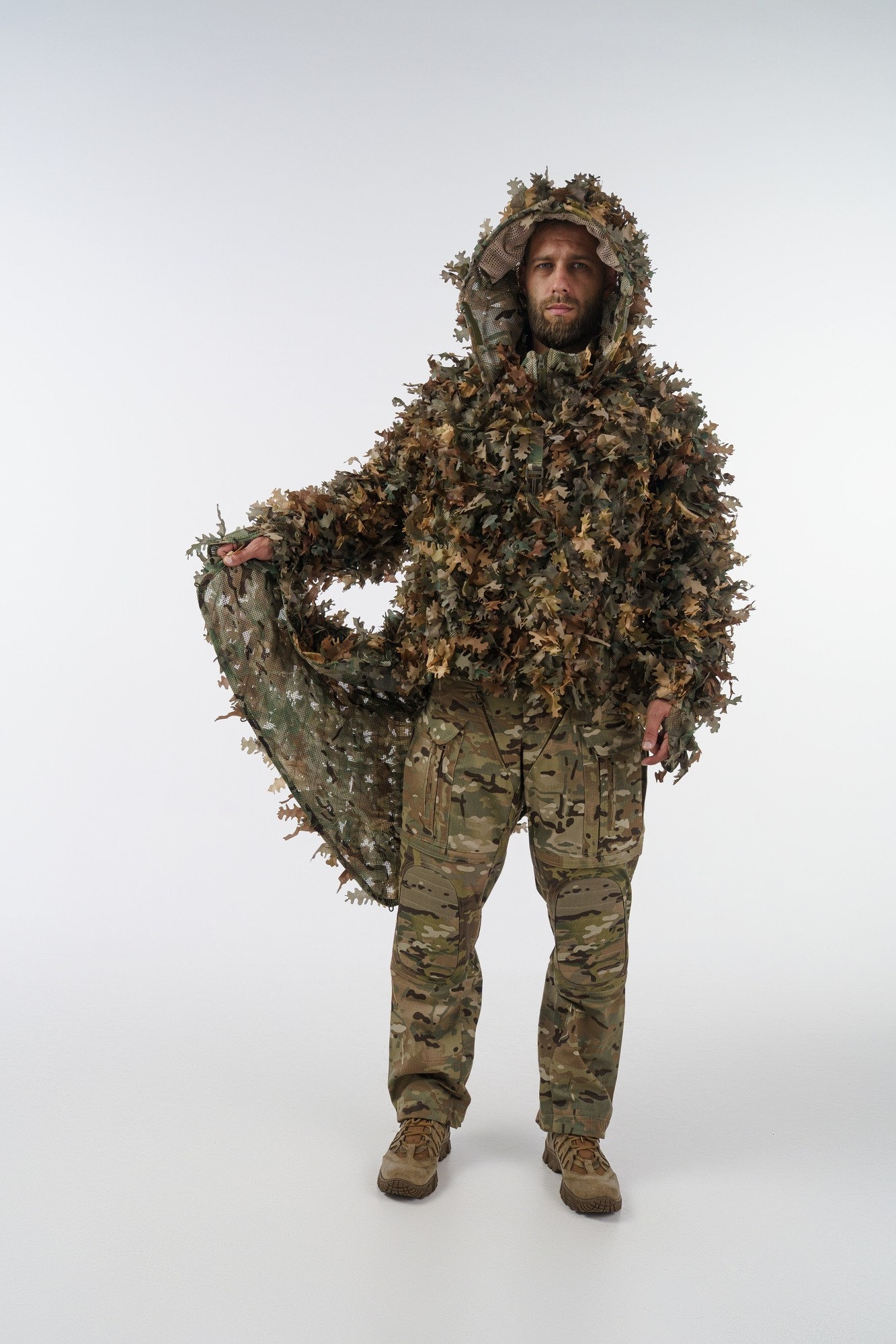 La cape Viper 3-en-1 est une cape de camouflage polyvalente qui se transforme en capuche ou en dos Viper grâce à sa conception modulaire. Fabriquée en nylon Multicam résistant avec des feuilles de camouflage 100 % coton recyclé, elle est dotée d'une capuche à visière flexible, de coudes renforcés, d'une intégration MOLLE complète, d'une capuche et d'un volume ajustables, de passants de fixation aux manches et d'un voile de visage pliable. Taille unique, disponible en plusieurs coloris, avec possibilité de confection sur mesure.