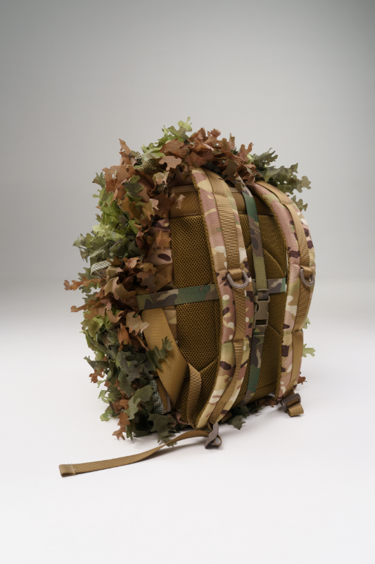 Système MOLLE — permet la fixation de camouflage naturel (feuilles, filet) et d'équipement supplémentaire.